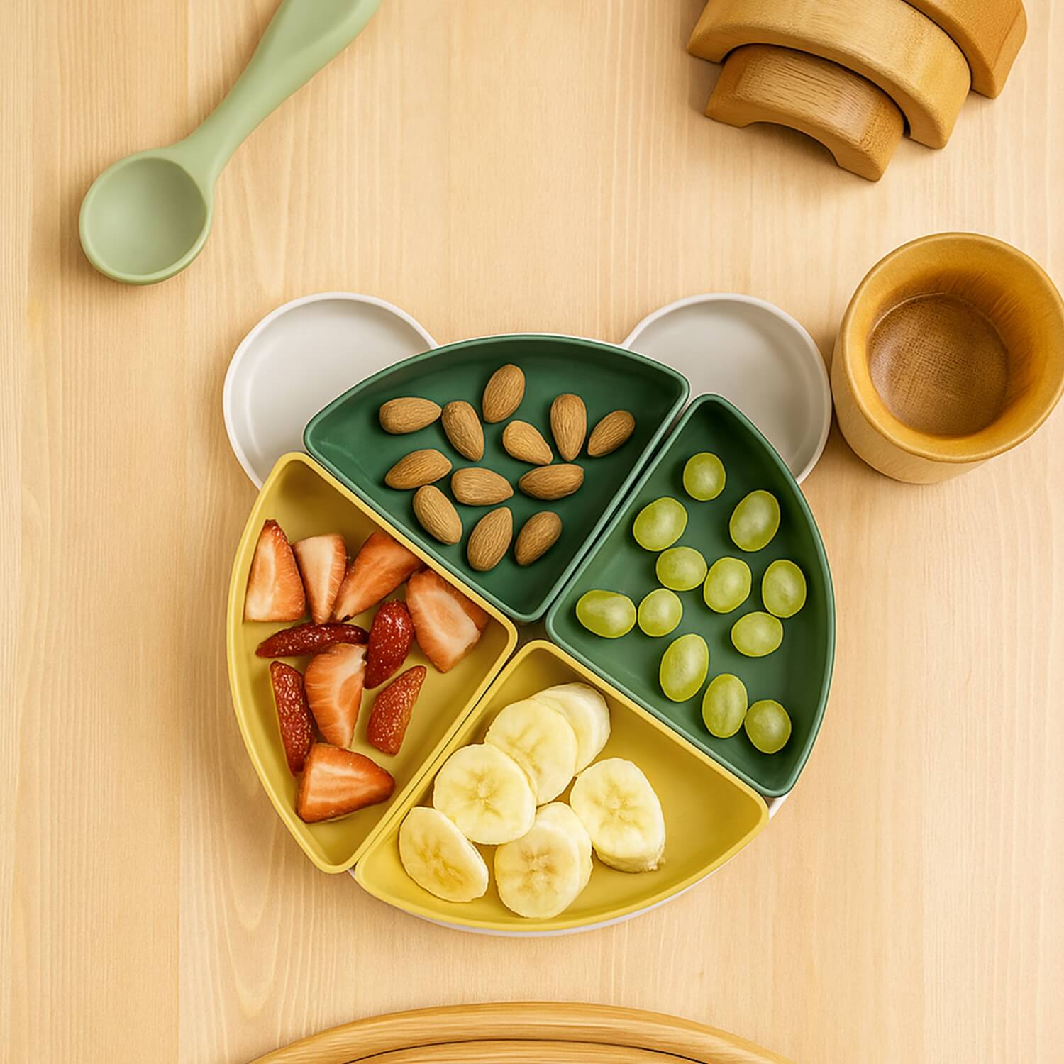 4 separate portioning containers prevent products from mixing together. It is a specially adjusted size for children.