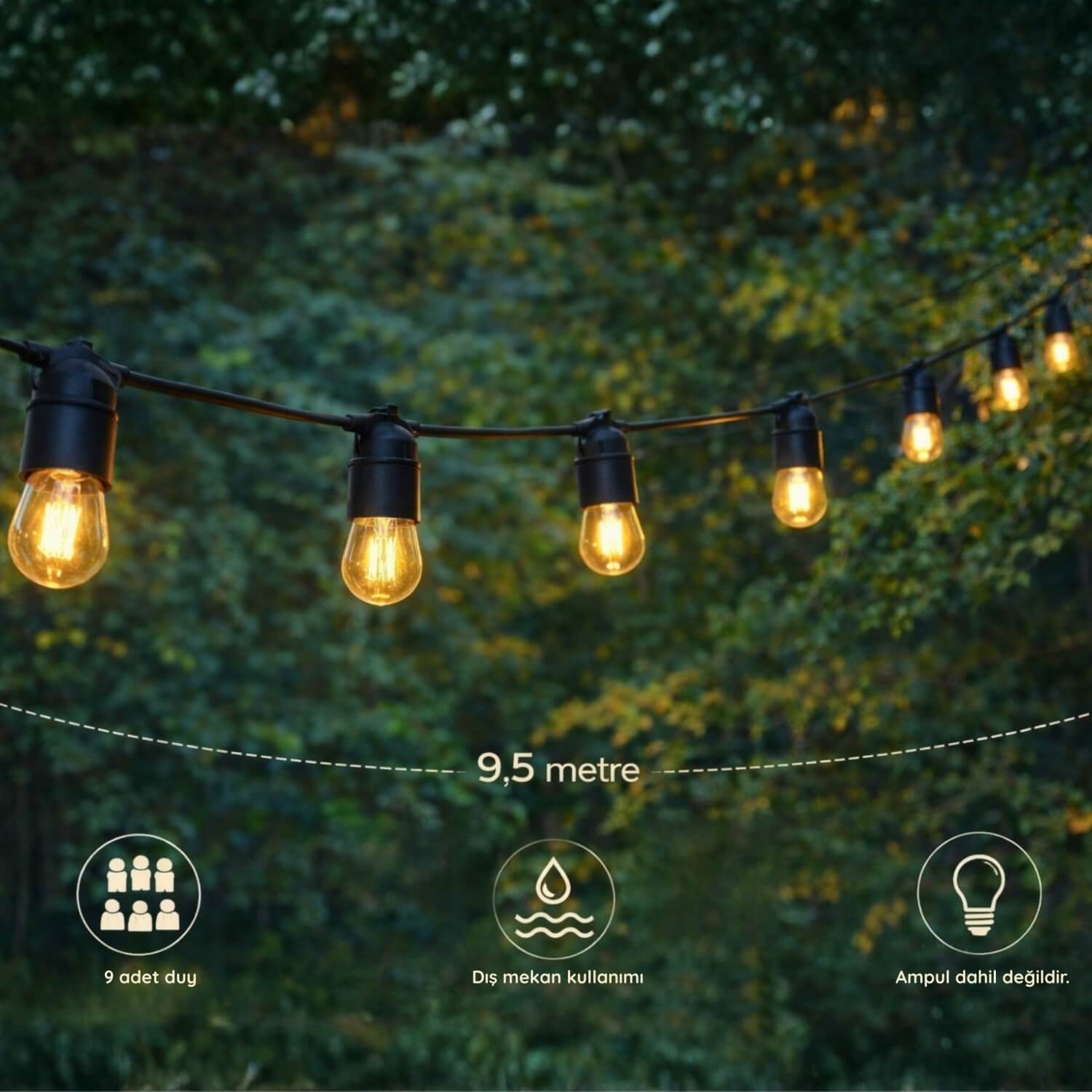 Şık ve sıcak bir ambiyans oluşturan bu dekoratif ışık zinciri, balkon, bahçe ve teras gibi alanlara estetik bir dokunuş katar. Dayanıklı yapısı sayesinde dış mekân kullanımına uygundur ve yaşam alanlarını daha davetkâr hale getirir.